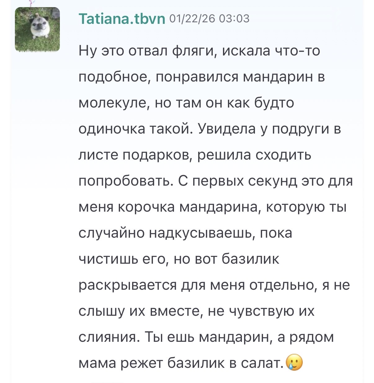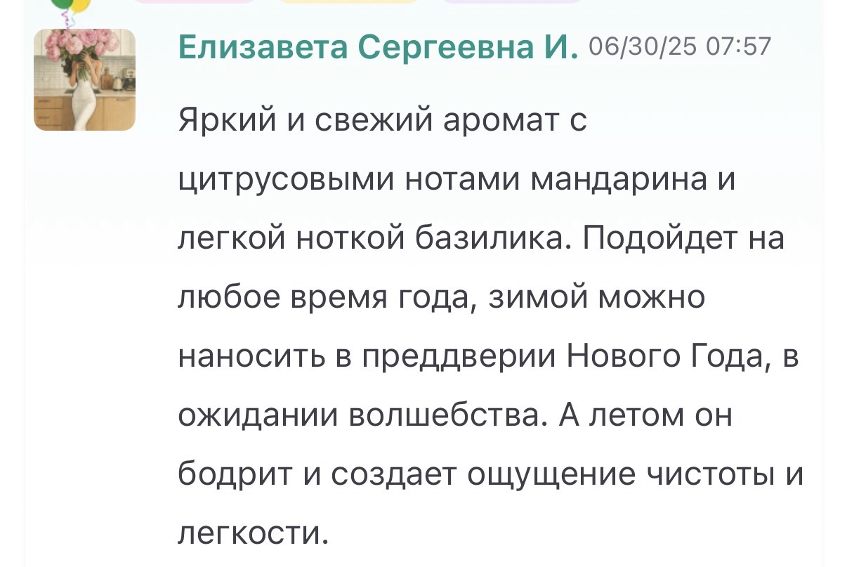Ароматическая композиция Mandarine Basilic начинает звучание с игристой свежести цитрусовых нот сладкого мандарина и солнечного апельсина, подчеркнутой тонким запахом зеленого чая и пряными тонами листьев плюща. В сердечном аккорде искрящаяся чистота сочного мандарина дополнена свежестью базилика с анисовым оттенком. Изысканные цветочные ноты шелковисто-пряной ромашки и душистого пиона придают композиции особую нежность и романтизм. Взрыв свежести и дарящих радость тонизирующих нот зеленого чая детонируются изысканными древесными нотами бархатисто-сливочного сандала, окутанного мерцающей амбровой дымкой.